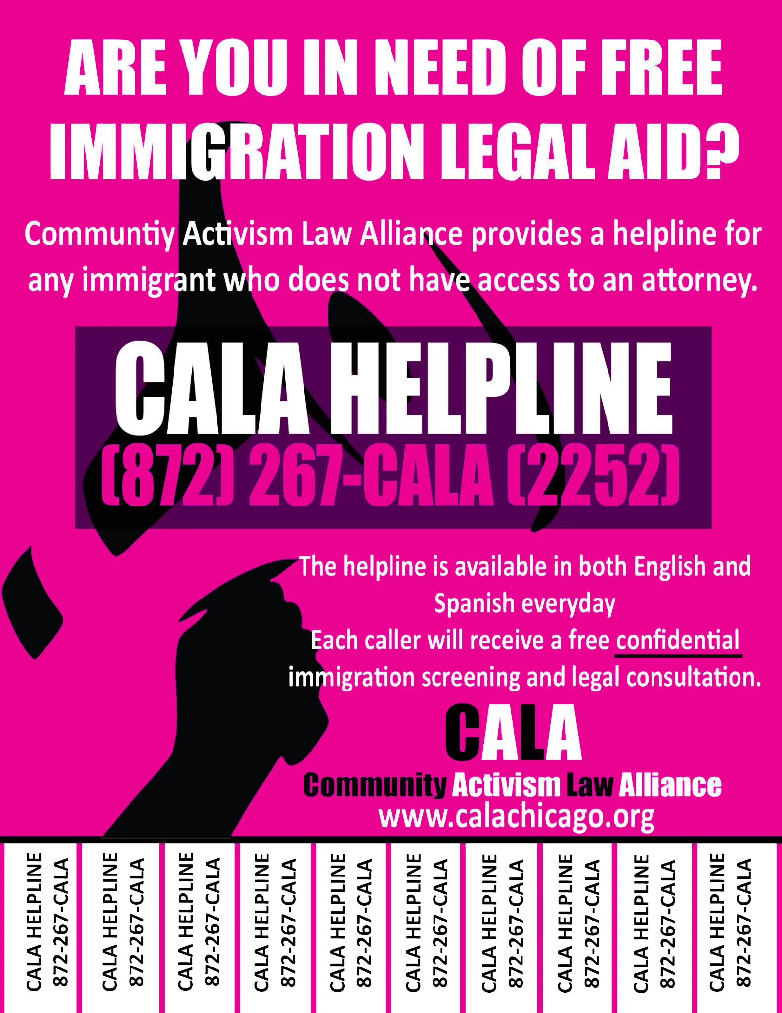 To address the increasing concerns of immigrant communities and Their allies, CALA has created special initiatives to help. These initiatives extend our free legal services to more immigrants who do not have access to an attorney. One of these is the CALA Helpline.CALA now provides a free helpline to any immigrant caller without access to an attorney. Every caller will receive a free immigration screening and legal consultation. The helpline operates both in English and Spanish and will be regularly checked every weekday. Every caller must leave a message and All calls will be returned for a free immigration screening within 7 days.